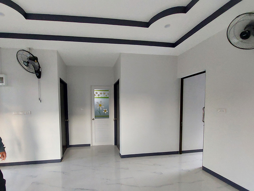ส่วนของห้องโถงกลางรับแขกปูพื้นด้วยกระเบื้องลายหินอ่อน ผนังสีควันบุรี่และฝ้าเพดานแบบหลุ่มเล่นระดับสวยงาม