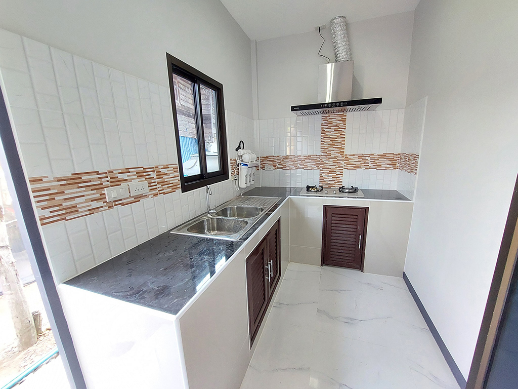 ส่วนของห้องครัวเป็นแบบเคาน์เตอร์ซิงค์ปูนติดด้วยงานกระเบื้องรูปทรงตัวแอล ผนังห้องครัวติดด้วยกระเบื้องบางส่วน พื้นปูด้วยกระเบื้องลายหินอ่อนเช่นกันและมีประตูออกหลังบ้านซักล้างได้