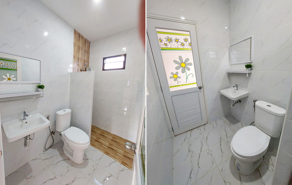 ห้องน้ำ ตามจุดต่างๆติดตั้งสุขภัณฑ์ที่หลากหลาย พร้อมใช้งาน พื้นห้องปูกันลื่นด้วยกระเบื้องโทนสีขาว ผนังใช้กระเบื้องโทนสีขาว พร้อมติดตั้งช่องลมระบายอากาศขนาดใหญ่