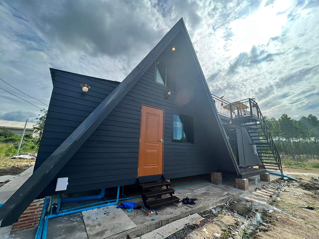 - แข็งแรงทนทาน โครงสร้างของบ้านทรงเอเฟรมมีความแข็งแรงและทนทานต่อแรงลมแรง