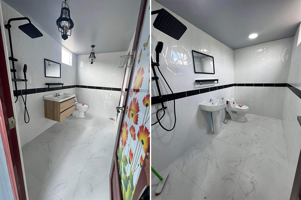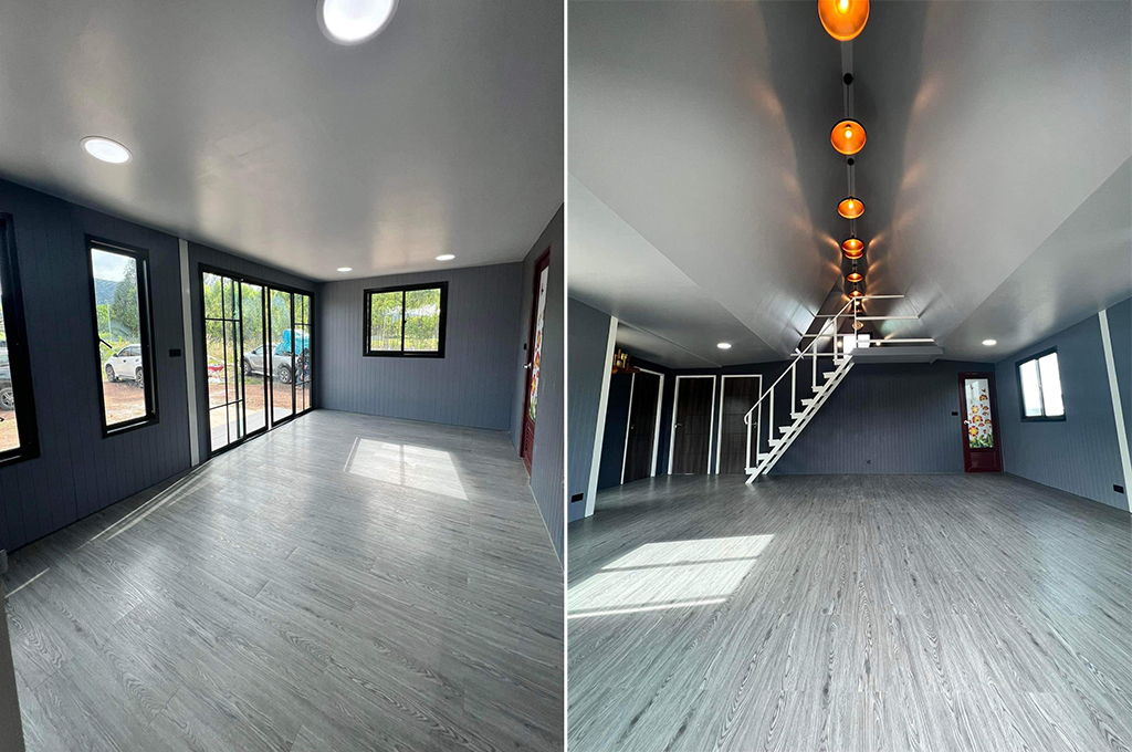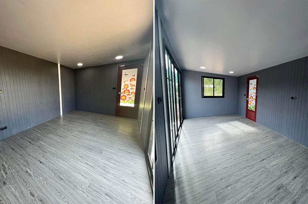 ภายในบ้านตกแต่งยางเรียบหรูผนังโทนสีเทา ฝ้าเพดานเรียบติดตั้งโคมไฟ และหลอดไฟแสงสว่างให้อย่างดีสวยงาม