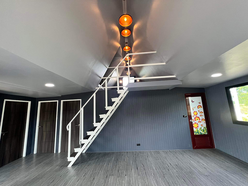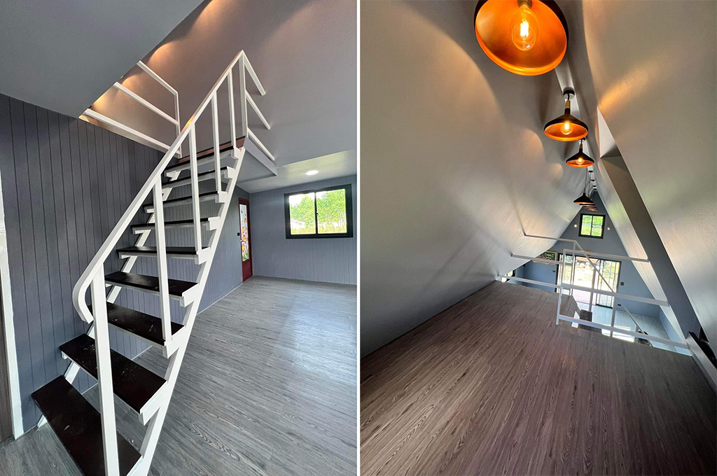 ด้วยการออกแบบของ บ้านน็อคดาวน์ทรงเอเฟรม หลังนี้ เน้นให้มีความแปลกใหม่สะดุดตา ตั้งแต่แรกเห็นพื้นที่ด้านหน้าเป็นทรงตัวเอ ระเบียงด้านหน้าบันไดทางขึ้นมีพื้นที่ใช้สอยปริมาณ ที่พอเหมาะพอดีหรืออาจจะเป็นที่นั่งพบปะ อากาศยามเช้าก็ย่อมได้